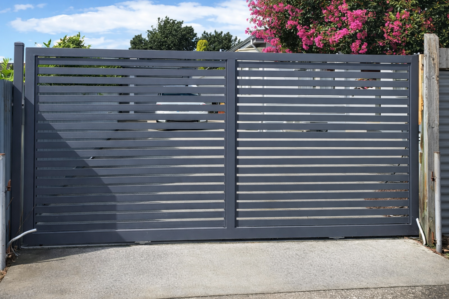 Sliding gates save space and handle slopes and wind. Swing suits flat sites with room for the leaf arc. We confirm onsite.